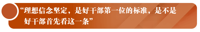 理想信念坚定,是好干部第一位的标准,是不是好干部首先看这一条。如果理想信念不坚定,不相信马克思主义,不相信中国特色社会主义,政治上不合格,经不起风浪,这样的干部能耐再大也不是我们党需要的好干部。只有理想信念坚定,用坚定理想信念炼就了“金刚不坏之身”,干部才能在大是大非面前旗帜鲜明,在风浪考验面前无所畏惧,在各种诱惑面前立场坚定,在关键时刻靠得住、信得过、能放心。《在全国组织工作会议上的讲话》(2013年6月28日)