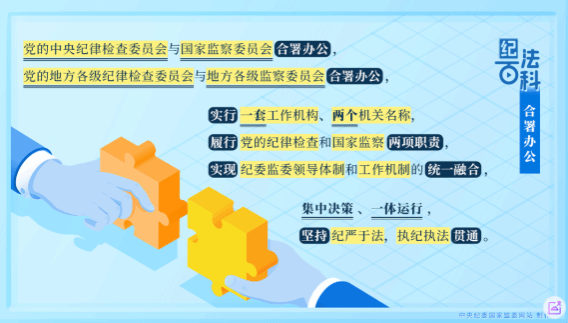 2018年3月,国家监察委员会依法组建,与中央纪委合署办公。合署办公后的中央纪委国家监委,一套人马、双重职责,既是执纪机关,履行党章赋予的监督执纪问责职责,又是执法机关,履行宪法法律赋予的监督调查处置职责,实现党内监督和国家机关监督、党的纪律检查和国家监察有机统一。