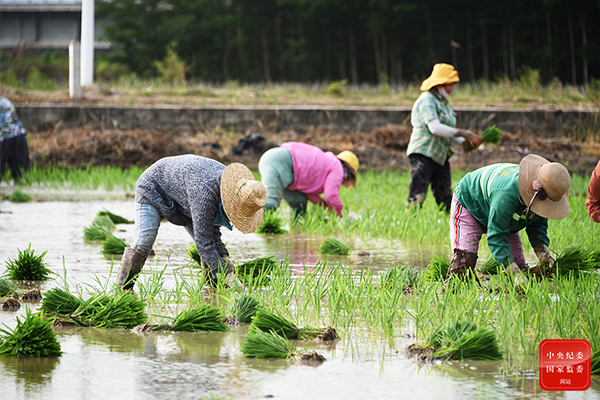 海南省三亚南红农场稻田里,农民们正在插秧。(海南省三亚市纪委监委供 陈聪聪 摄)
