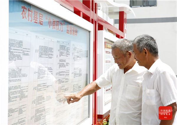 安徽省亳州市利辛县纪委监委积极探索破解农村基层“小微权力”监督难题,制定事项、权力、责任、监督“四项清单”,加强“小微权力”监督制约,扎紧制度笼子,规范“小微权力”运行。图为该县永兴镇程湖村群众在村部公示栏了解“四项清单”有关情况。(安徽省亳州市纪委监委 程伟如 摄)