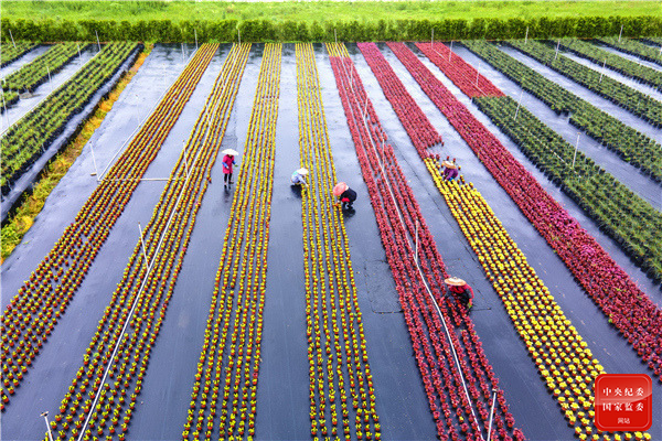 贵州省黄平县旧州镇文峰村积极调整农业产业结构,通过“支部+产业+农户”的发展模式,建设400余亩花卉苗木基地,促进农民增收,助力乡村振兴。图为当地群众在花卉苗木种植基地管护花卉。(贵州省黄平县纪委监委 潘锋 摄)
