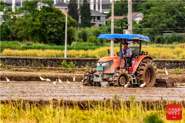 浙江省建德市通过规模化、科学化种植做强做精农业产业文章,带动越来越多的村民增收致富。图为种粮大户开着拖拉机忙着犁田作业,一群白鹭飞到田里觅食,呈现出一派动人和谐的景象。(浙江省建德市纪委监委 苏思思摄)